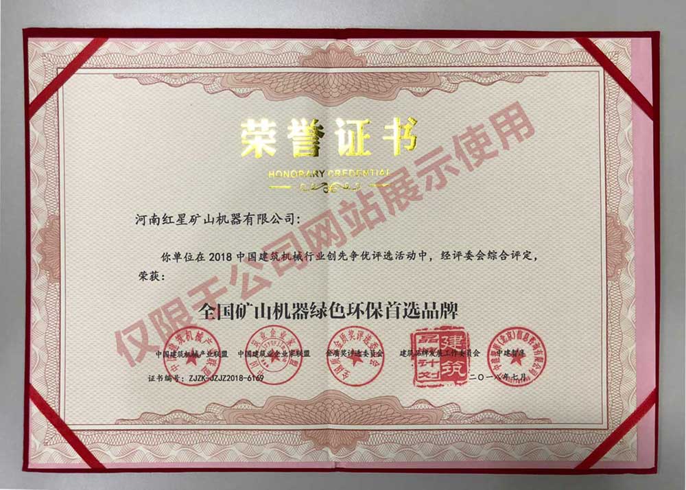 為順應綠色礦山時代發展需要,結合客戶實際現場需求,紅星一直在設備研發路上奮進,被評為“全國礦山機器綠色環保首選品牌”。查看證書
