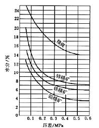 要現(xiàn)在過(guò)濾機(jī)工作的情況下改善過(guò)濾效果,更有效的方法就是提高過(guò)濾壓差,壓差對(duì)不同物料濾餅水分的影響如圖3所示。但要把真空狀態(tài)下使用的盤式過(guò)濾機(jī)改為正壓狀態(tài)下過(guò)濾,并應(yīng)用到工業(yè)生產(chǎn)中卻難度很大,主要體現(xiàn)在兩個(gè)方面:其一是由于過(guò)濾壓差增大,過(guò)濾速度加快,對(duì)于過(guò)濾機(jī)的結(jié)構(gòu)和性能提出一些要求;其二是在壓力密封條件下,要將濾餅順利排出且阻止壓氣逸出,也對(duì)加壓過(guò)濾技術(shù)提出更高的要求。